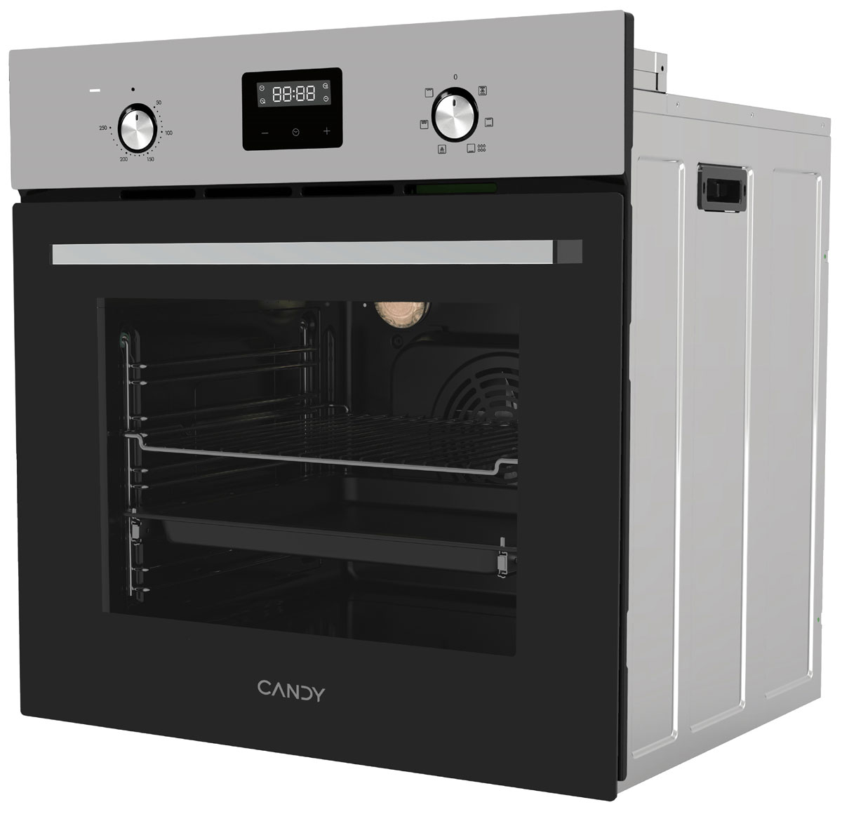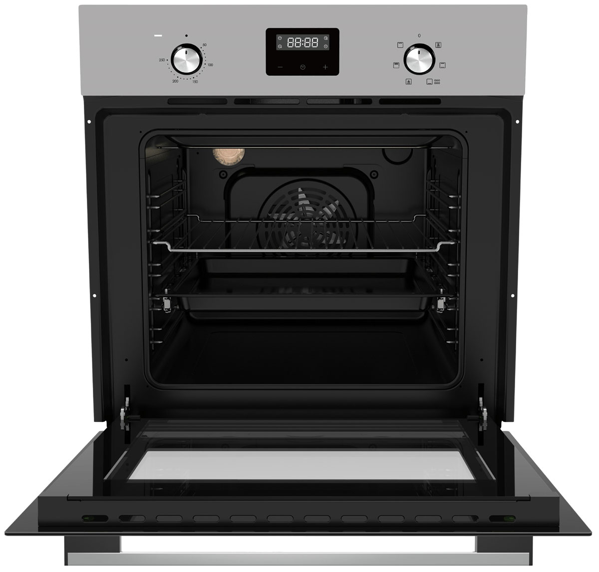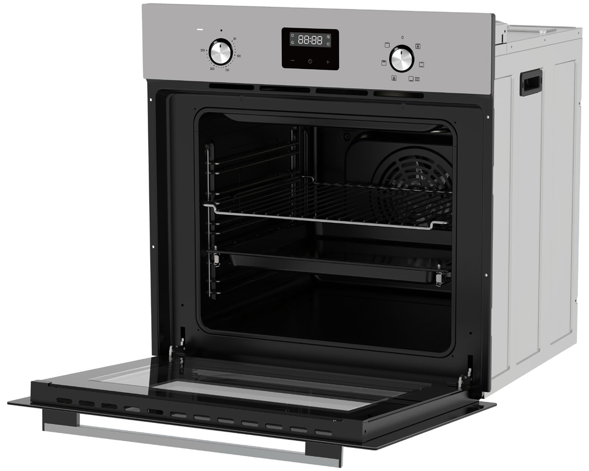 Гриль позволяет получить хрустящую корочку, а конвекция — румяное и сочное блюдо. Таймер рассчитан на установку времени работы, по окончании которого срабатывает звуковой сигнал. Основная информация отображается в виде символов белого цвета на небольшом дисплее. Встроенный вентилятор охлаждения двери защищает кухонную мебель от нагревания. Лампа на 25 Вт освещает всё пространство камеры для удобного контроля за процессом выпекания за закрытой дверцей. Защита от детей. Электронный программатор с 14 автоматическими программами. Защитное покрытие от отпечатков пальцев. Класс энергоэффективности — A.