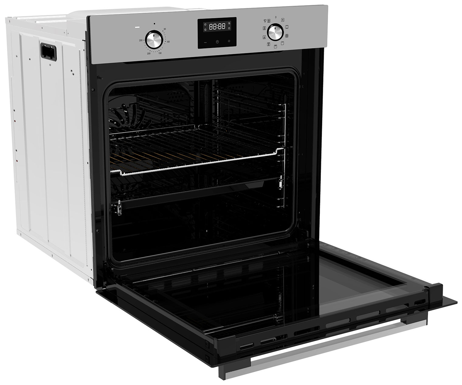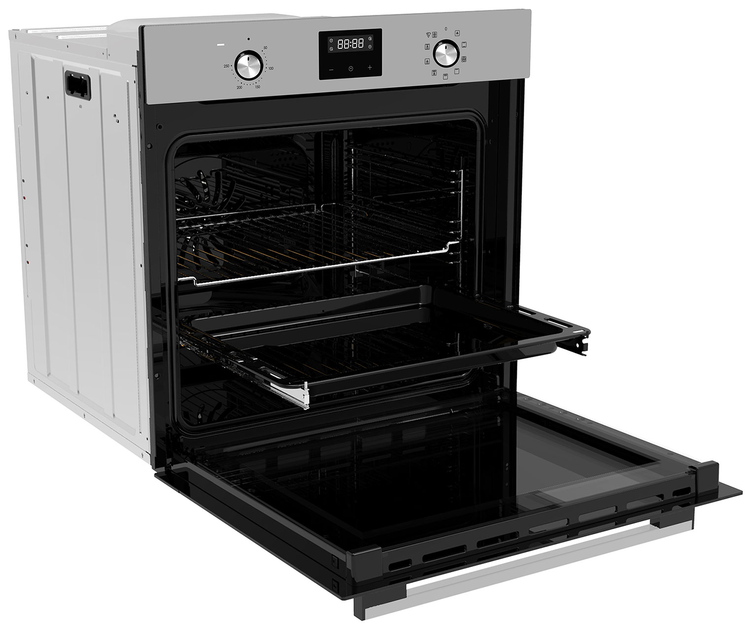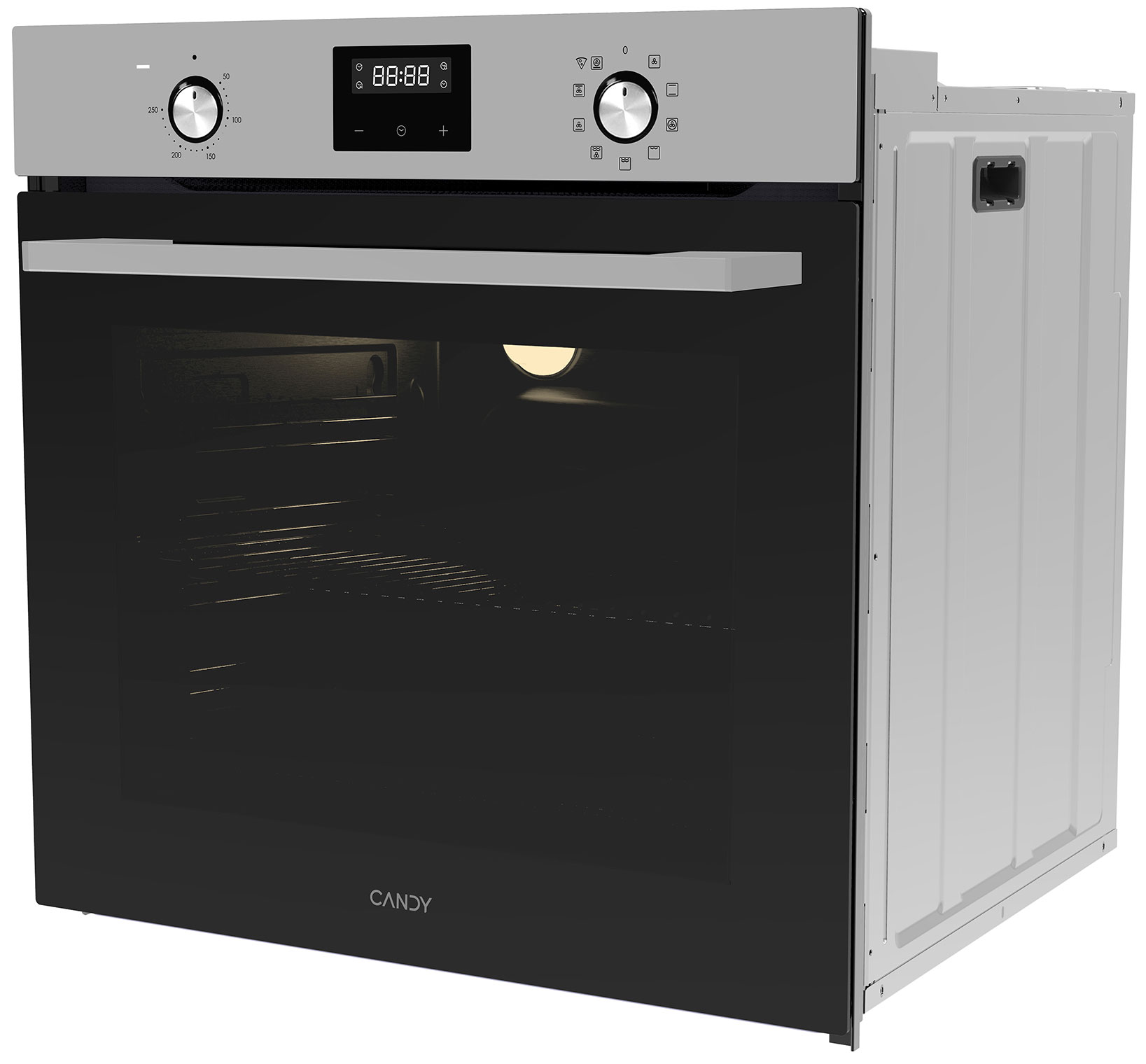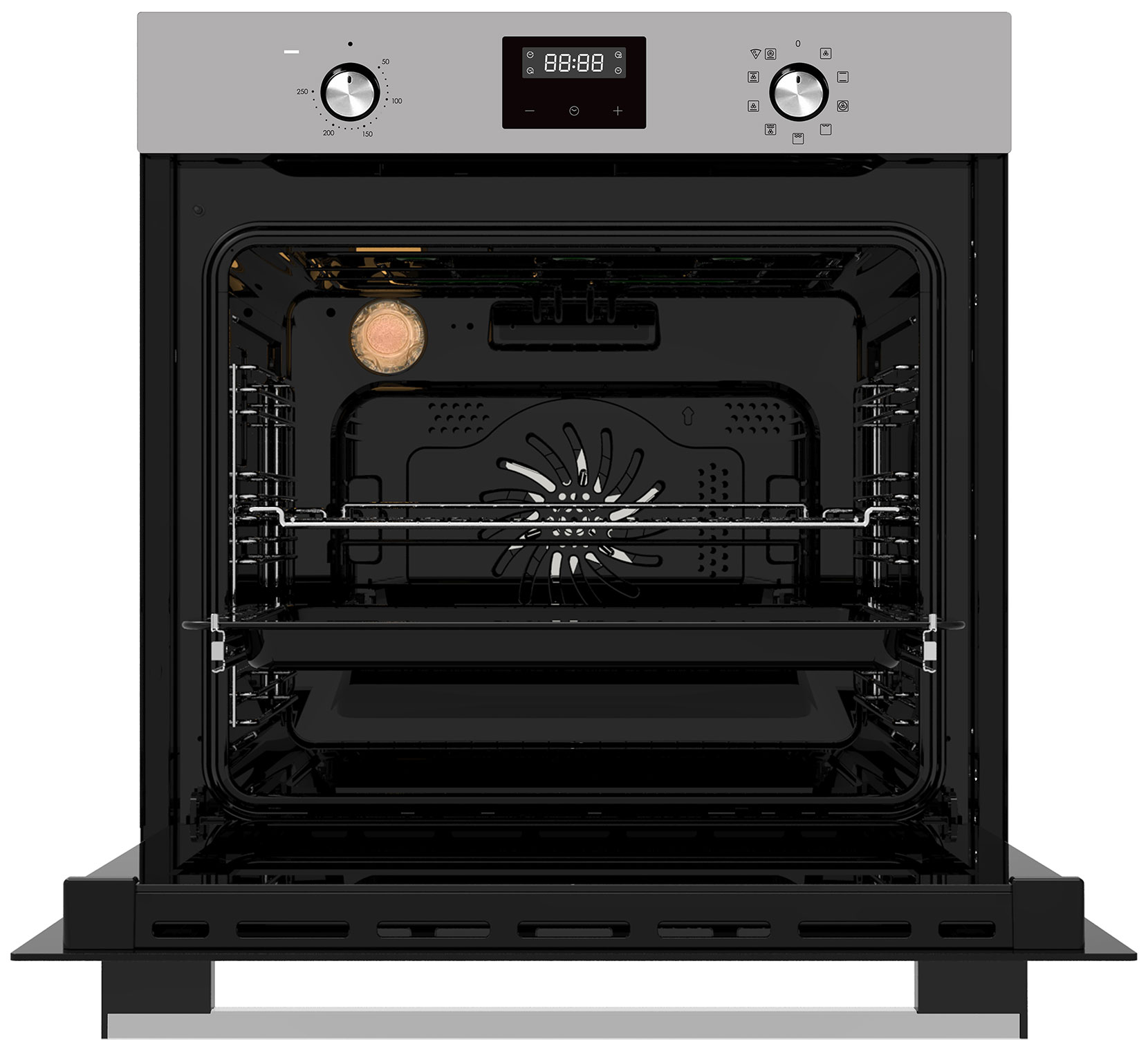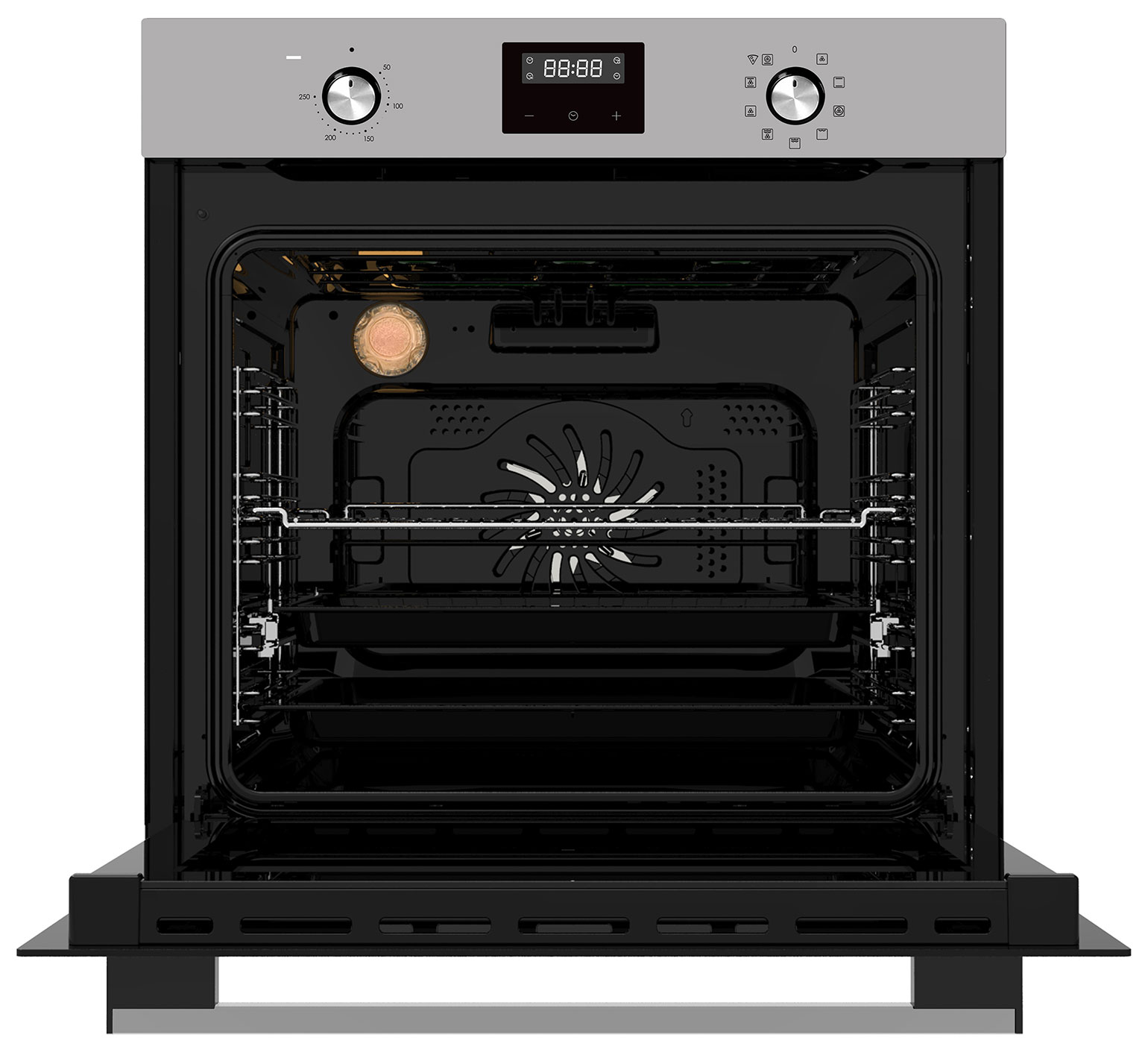 Электронный программатор с 14 автоматическими программами. Сенсорная панель управления. Защитное покрытие от отпечатков пальцев. Индикация включения, времени приготовления и режима работы. Звуковой сигнал. Вентилятор охлаждения корпуса. Защита от детей. Лампа на 25 Вт для освещения камеры, чтобы можно было контролировать процесс выпекания за закрытой дверцей. Класс энергоэффективности — A.
