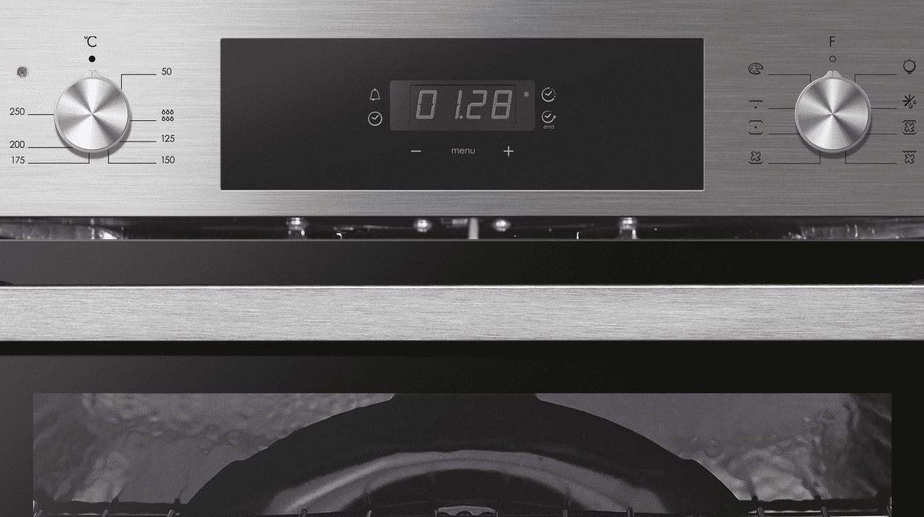 Комбинированное управление. Регулировать температуру нагрева в диапазоне от 50 °С до 250 °С и осуществлять другие настройки можно с помощью сенсорных кнопок и двух поворотных регуляторов. Электрический гриль. Применяется для приготовления мяса, овощей, рыбы и остальных продуктов до хрустящей корочки без добавления растительного масла. Замок от детей. Галогенное освещение камеры. Защитное покрытие от отпечатков пальцев. Съёмные направляющие духовки. Сетевой кабель в комплекте (без вилки).