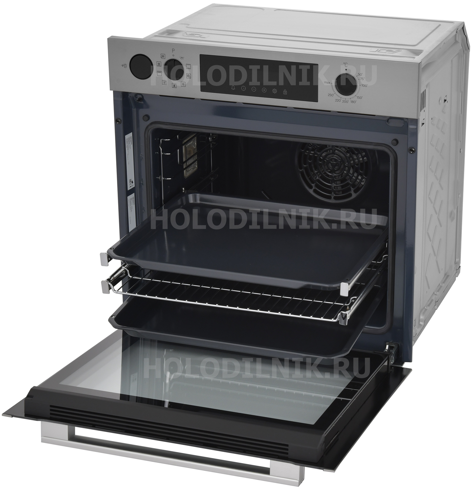 Комплект поставки: противень, дополнительный противень, металлическая решётчатая полка, руководство пользователя и другая документация.