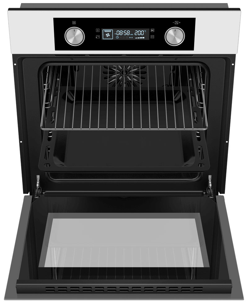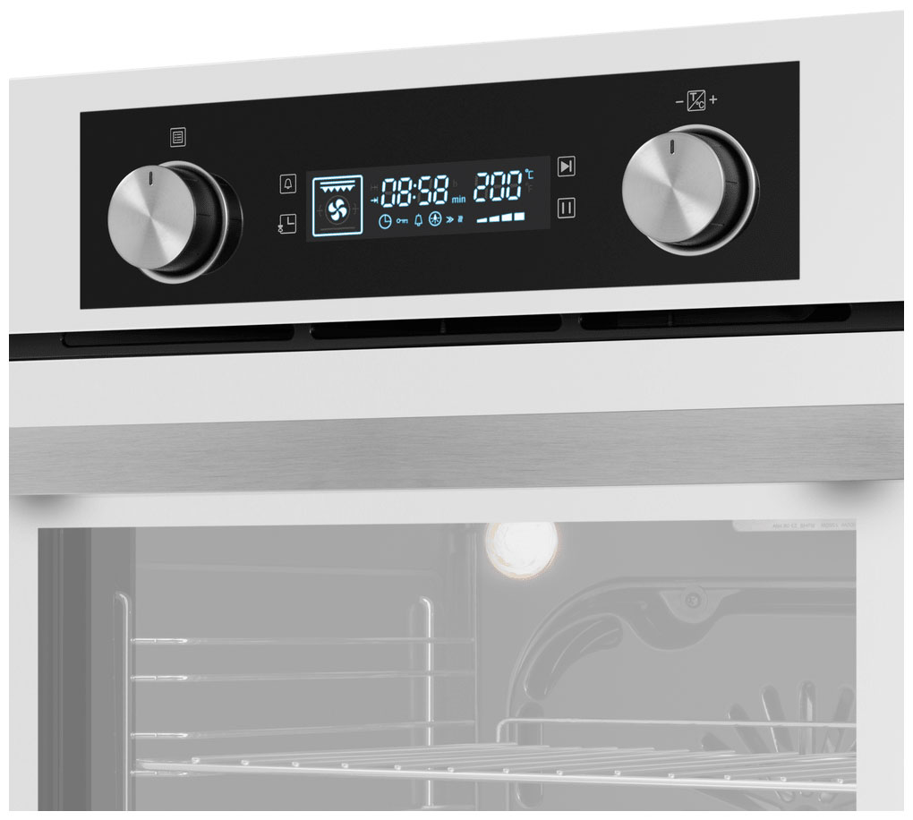 6 режимов работы: нижний газовый нагрев, конвекция с верхним и нижним нагревом, гриль, гриль с конвекцией, ECO и размораживание. Цифровой дисплей отображает выбранный режим работы, время и температуру. Внутреннее освещение позволяет контролировать процесс приготовления, не открывая дверцу шкафа. Функция «Блокировка от детей» блокирует элементы управления, чтобы избежать случайного включения духового шкафа детьми. Технология «Холодный фронт» оберегает от ожогов при прикосновении к духовке. Дверца с тройным стеклом обеспечивает надёжную теплоизоляцию и безопасность. Внутренняя камера покрыта специальной эмалью, облегчающей очистку.