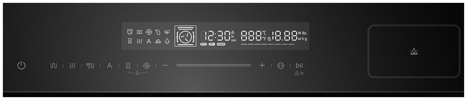 ECO, верхний + нижний нагрев + конвекция, верхний + нижний нагрев + конвекция + пар, гриль, двойной гриль + конвекция, нагрев кольцевым элементом, нагрев кольцевым элементом + пар, нижний + верхний нагрев, нижний нагрев, освещение, пар + верхний + нижний нагрев, пар + гриль, пар + нижний нагрев, подъем теста, размораживание, сушка
