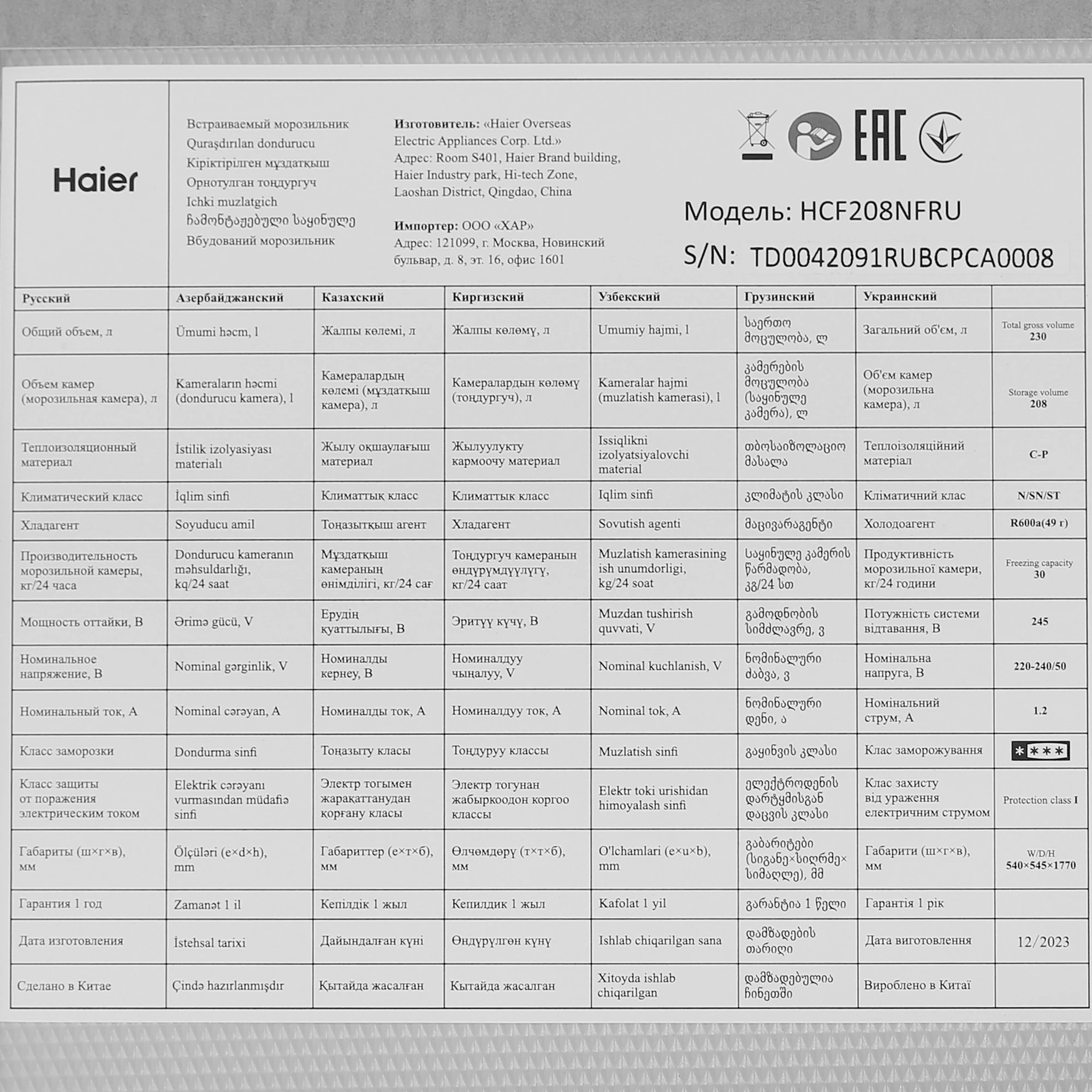 Купить Haier HCF208NFRU в интернет магазине Pm-Joy. Недорогие цены на