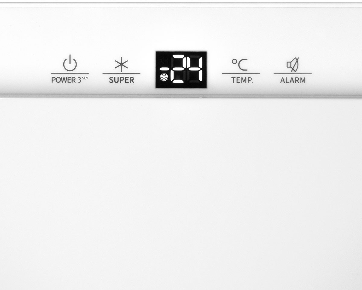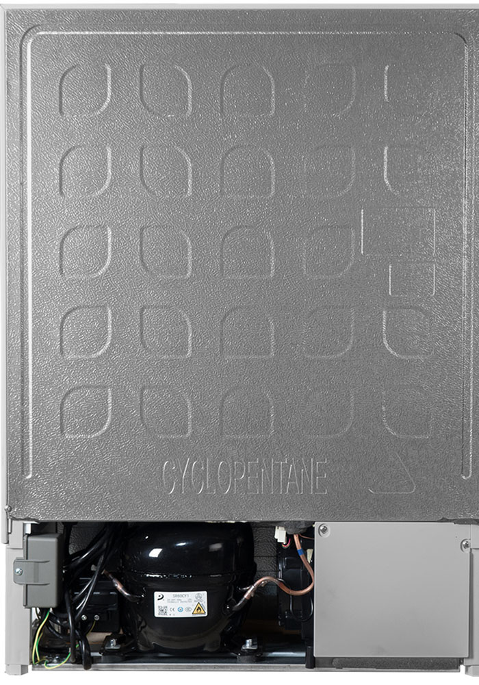 Съемные полки. Верхняя и средняя полки сделаны из стекла и без окантовки, они съёмные, что позволяет разместить внутри негабаритные продукты, например большой отруб мяса. Контейнер для льда. Входит в комплект, рассчитан на дюжину кубиков с гранью 25 мм Сигнализация о неисправности. возможность эксплуатации в неотапливаемых помещениях Отключение сигнализации открытия двери. Например, на время уборки. Для этого есть специальная кнопка Alarm. Капельная система размораживания